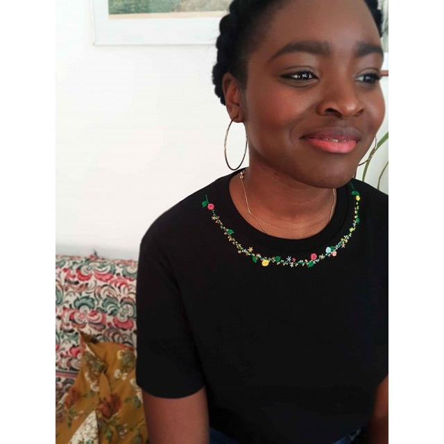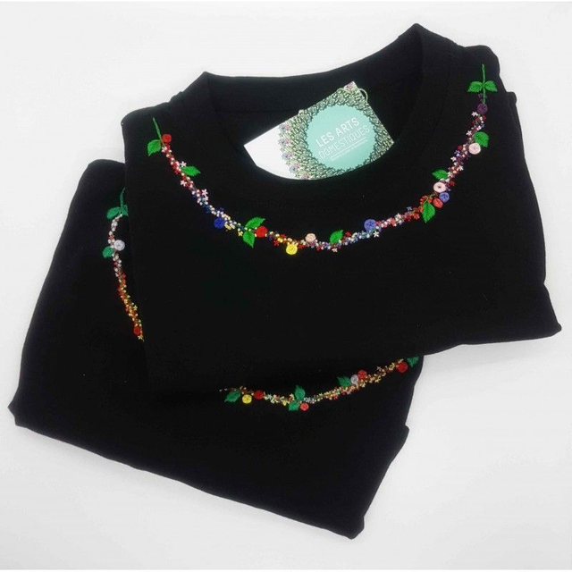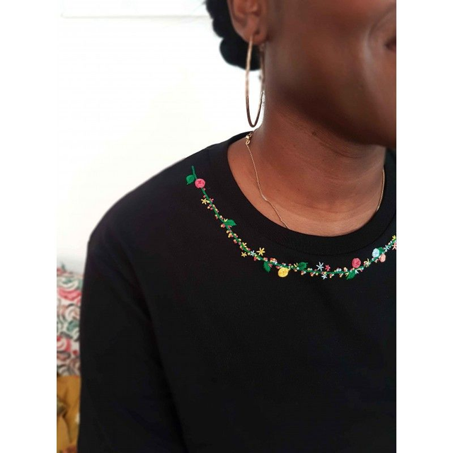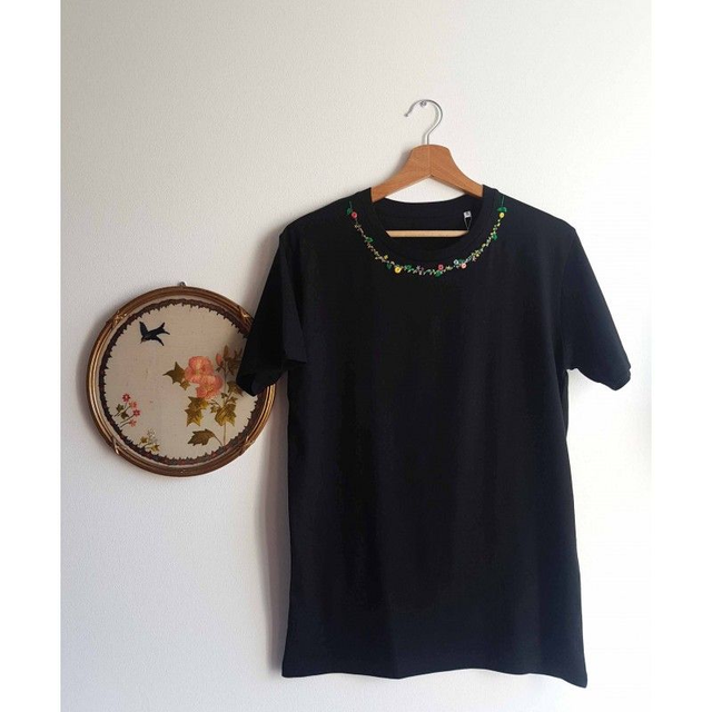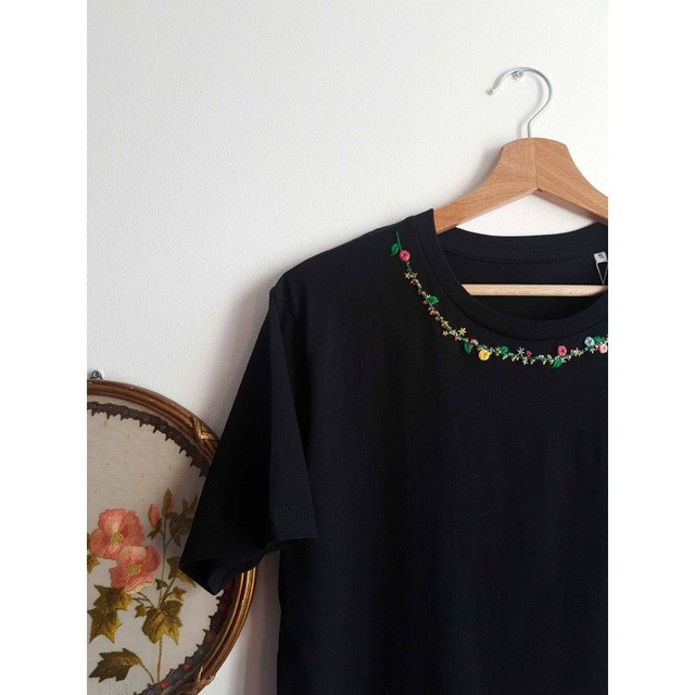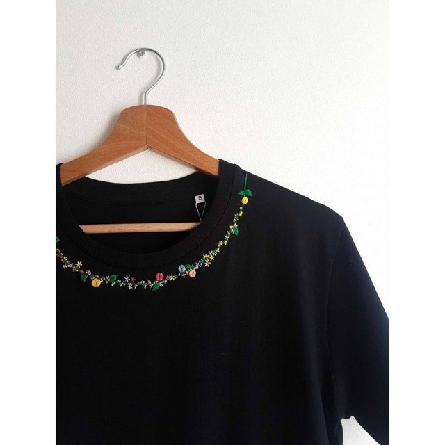 Un tee-shirt brodé à la main à Strasbourg. Le tee-shirt est un modèle unisexe, non cintré, 100% coton.